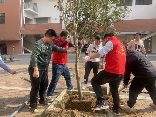 活動(dòng)中,基礎(chǔ)分公司黨員志愿者與銀山小學(xué)教職工熱情高漲,分工協(xié)作,有的松土挖坑、有的扶苗填土、有的澆水育苗,現(xiàn)場一派熱火朝天的忙碌景象。在大家的共同努力下,本次活動(dòng)共種植山茶花、鐵樹、桂花樹等樹苗60多棵。