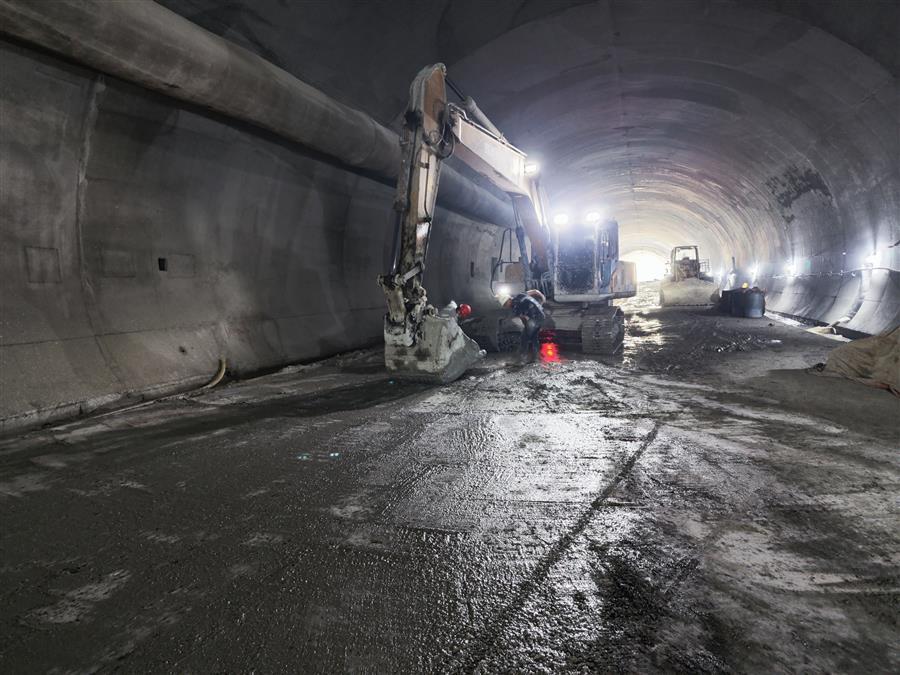 在施工現(xiàn)場,機器轟鳴,挖掘機正在對隧道明洞部分的土方進行開挖,出渣車有序作業(yè)外運渣土;工人們正有條不紊地焊接、搭建地連墻鋼筋籠;在隧道深處,一臺挖掘機在操作人員的操控下,正揮動著“手臂”,配合著工人在對隧道路面做清理?!盀榧涌祉椖渴┕みM度,我們采取人員倒班、設備不停,白天晚上不間斷施工?!表椖拷浝斫榻B說,目前隧道工程已全面貫通,爭取在春節(jié)前完成仰拱和墻供二襯砼澆筑。