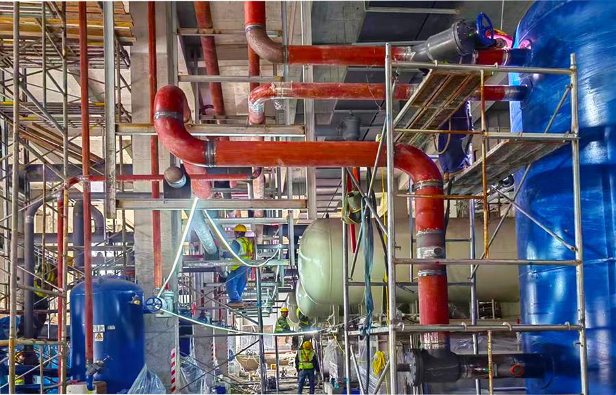 7月以來(lái),項(xiàng)目部精心組織,細(xì)化項(xiàng)目施工任務(wù),抓住施工“黃金期”加快推進(jìn)項(xiàng)目建設(shè)。項(xiàng)目全體人員頂著高溫酷暑,堅(jiān)守崗位,高標(biāo)準(zhǔn)、嚴(yán)要求,全力保障工程質(zhì)量和進(jìn)度,推動(dòng)項(xiàng)目建設(shè)順利有序進(jìn)行。目前,項(xiàng)目1#玉米加工車(chē)間屋面蒸發(fā)冷設(shè)備安裝完成,管道安裝完成90%;壓縮機(jī)、桶泵機(jī)組設(shè)備完成安裝,管道安裝完成50%、速凍機(jī)組設(shè)備安裝完成40%;3#配送中心機(jī)房屋面蒸發(fā)冷安裝完成及管道安裝完成80%;4#冷鏈配送中心室內(nèi)設(shè)備及管道安裝完成90%。