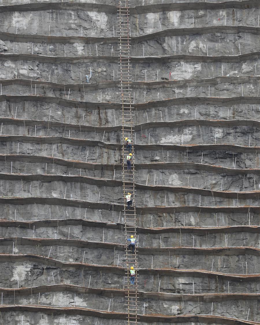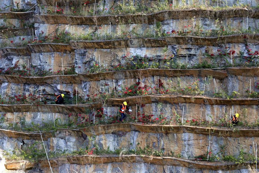 2021年12月19日,工人在樓梯山的峭壁上養(yǎng)護(hù)綠植。