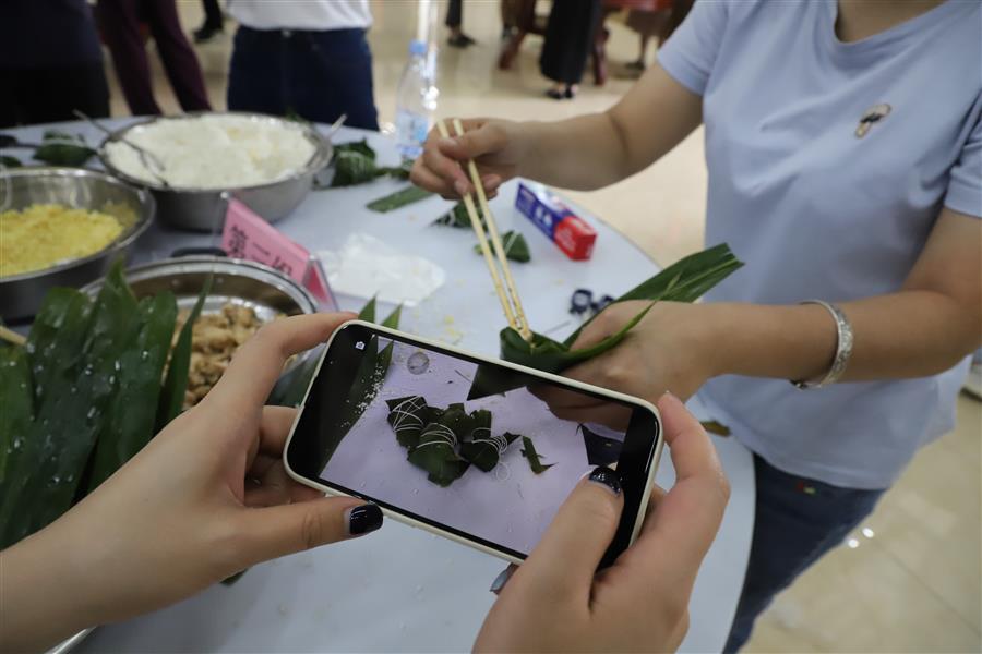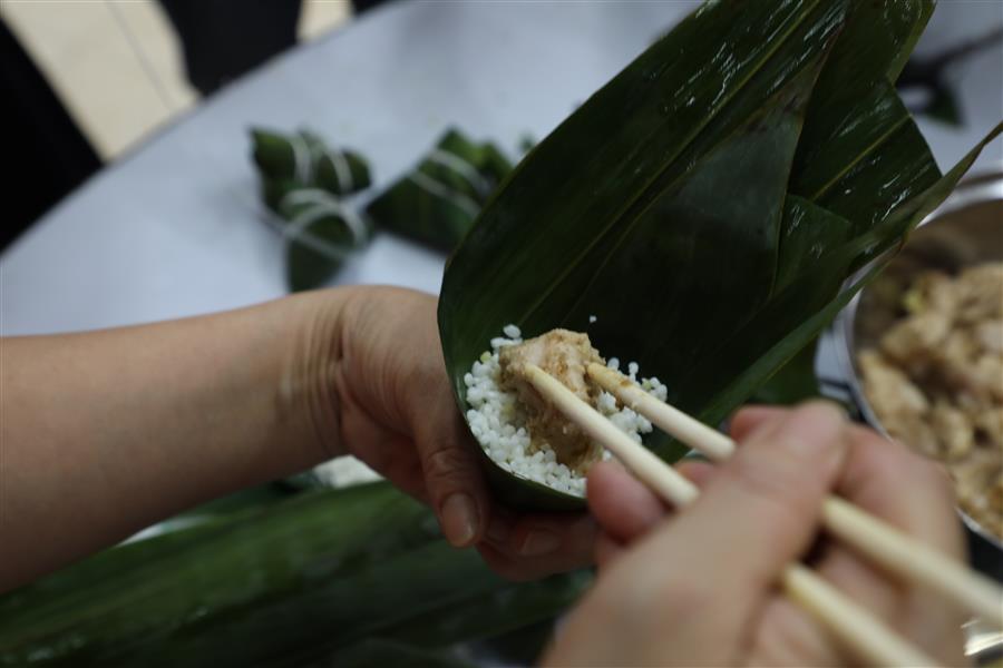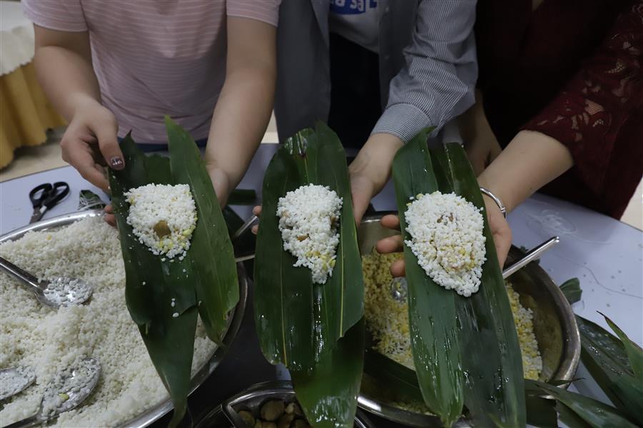 經(jīng)過(guò)簡(jiǎn)單的現(xiàn)場(chǎng)教學(xué)后,大家領(lǐng)取材料,分組配合,踴躍參與包粽子比賽,只見大家捋粽葉、放餡、封口、扎捆,動(dòng)作一氣呵成,不一會(huì)兒,一只只各式各樣的粽子就在大家手中成型。
